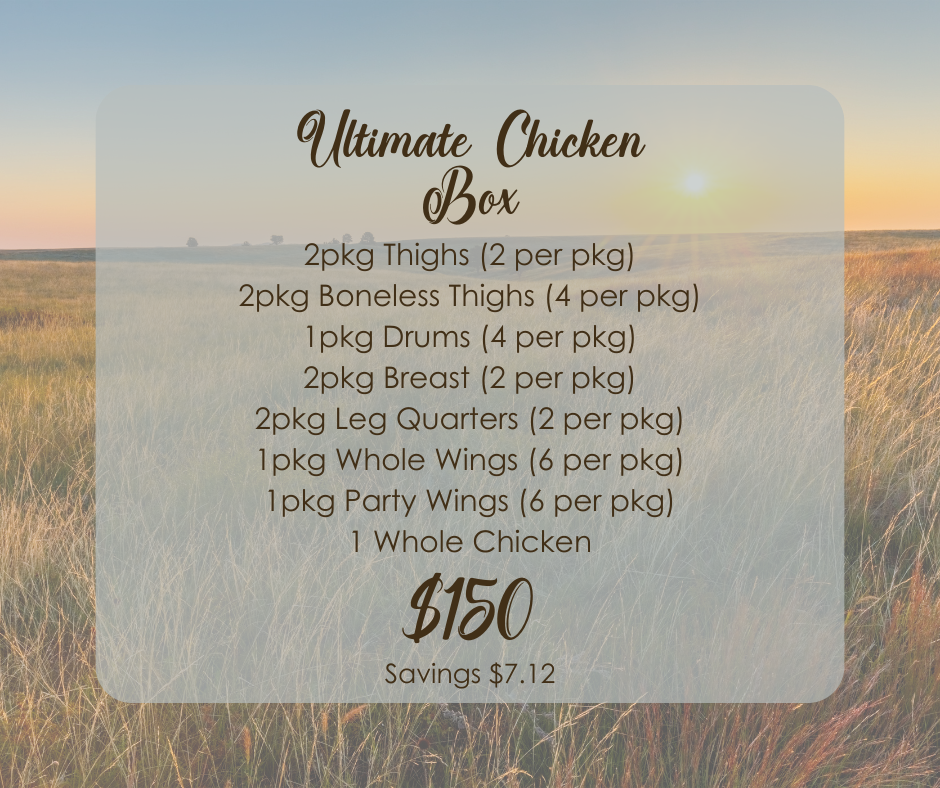 Have you been wanting to fill your freezer with chicken? Now is the perfect time to save over $7 with our Ultimate Chicken Box! This box includes 2 packages of bone-in thighs (2 per package), 2 packages of boneless thighs (4 per package), 2 packages of leg quarters (2 per package), 2 packages of breasts (2 per package), 1 package of drums (4 per package), 1 package of whole chicken wings (6 per package), 1 package of party wings (6 per package), and 1 whole chicken. Enjoy a variety of cuts ready to satisfy all your meal needs while saving money!